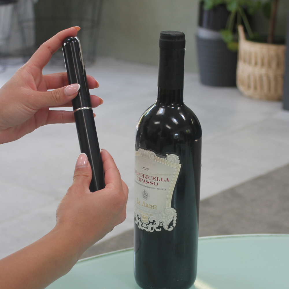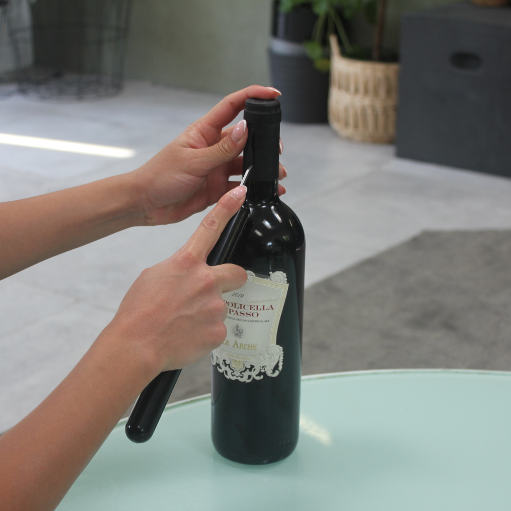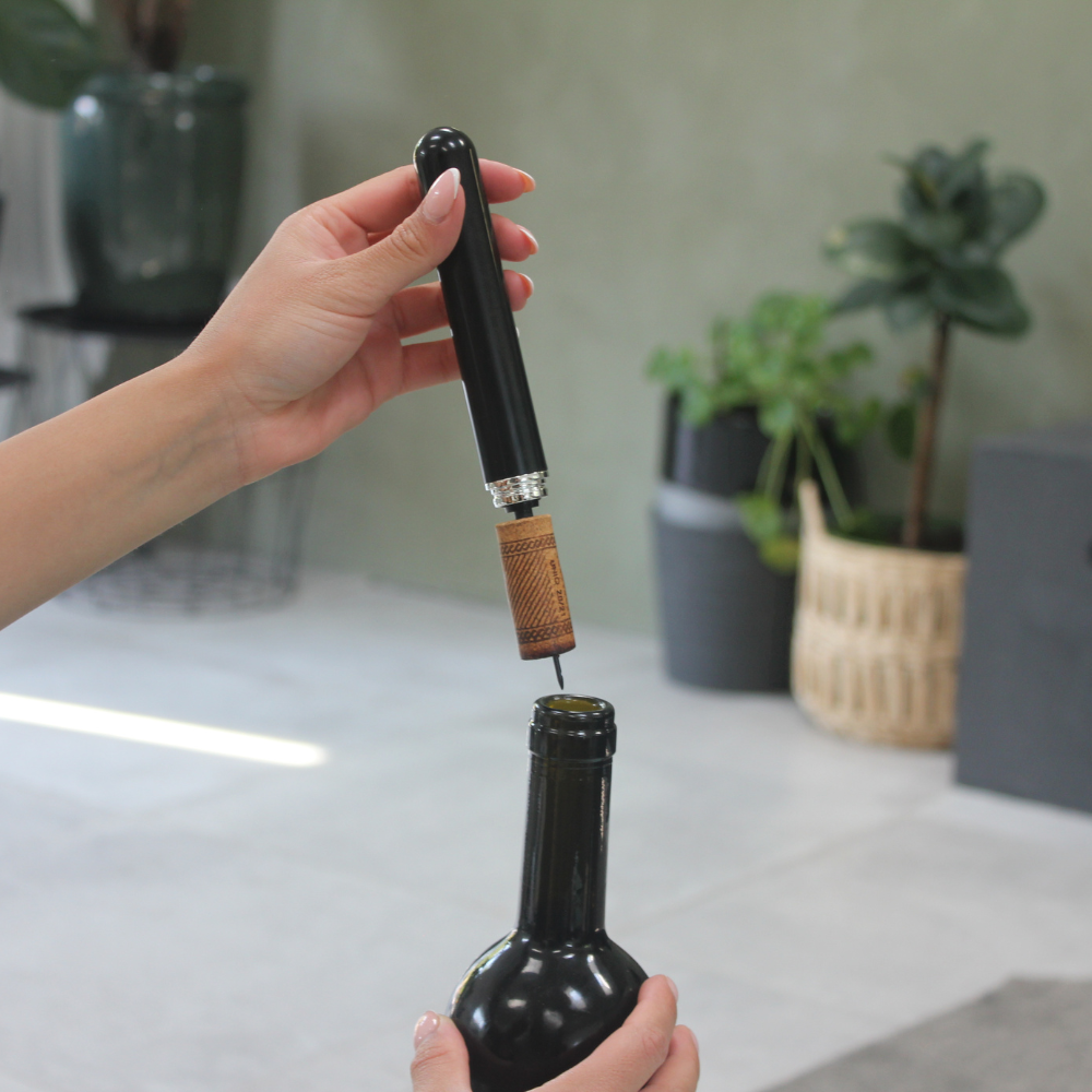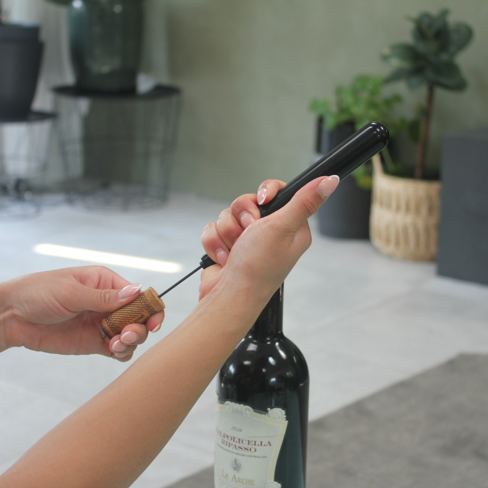 Glem alt om besværlige korkskruer og elektriske proptrækkere. Med vores lufttrykbaserede proptrækker åbner du vinflasken let, elegant og uden at ødelægge korken. Stik nålen ned i proppen, pump nogle få gange – og pop, så er flasken åben. Perfekt til både hverdagsbrug og til vinentusiasten, der vil have noget anderledes.